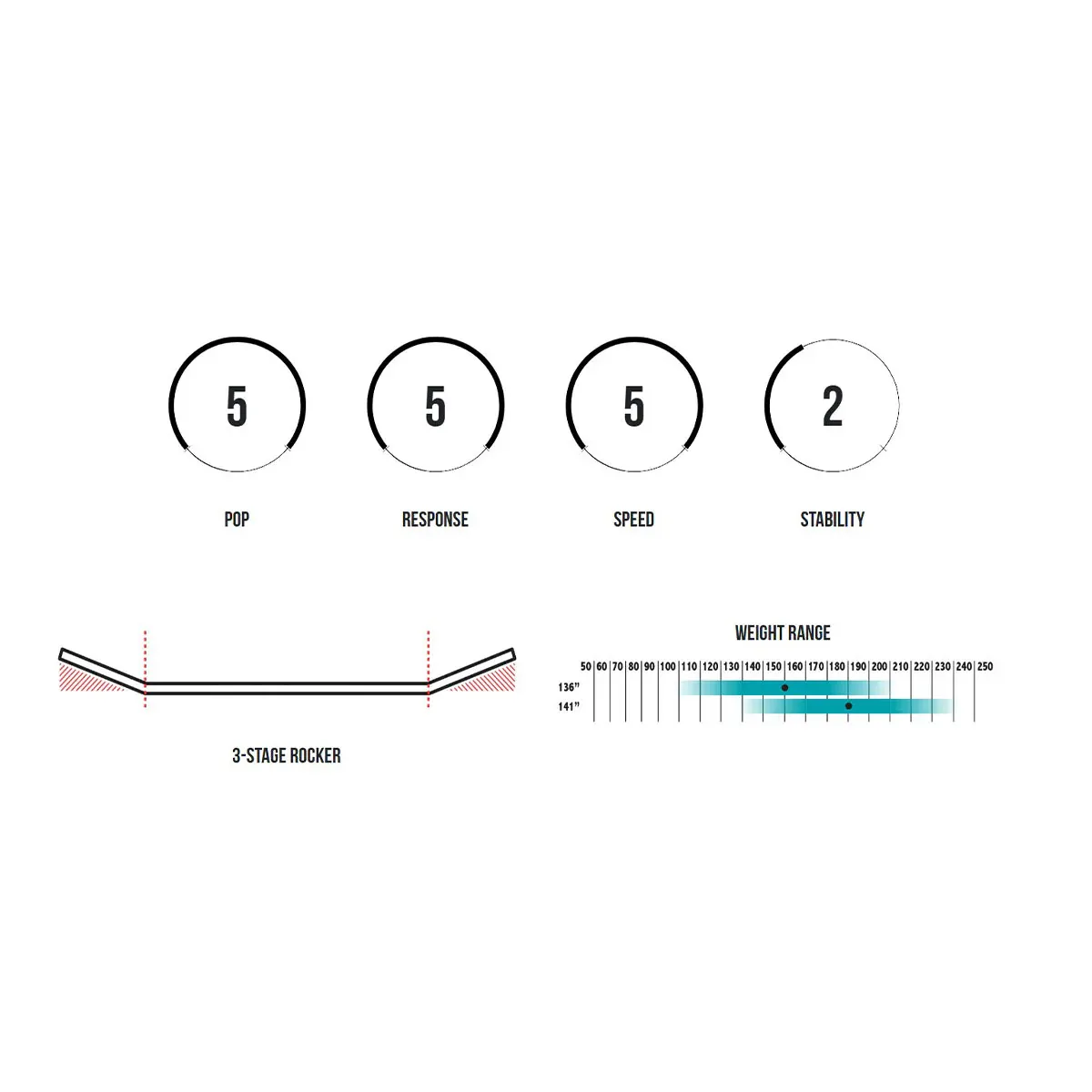 - This rocker line is generally flatter between the bindings but dramatically angles upward towards the tip and tail. This explosive rocker line generates a more aggressive and vertical pop off the wake.
