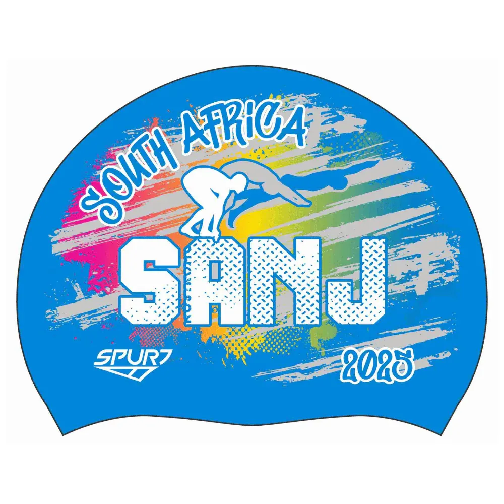 Be the first to review “SANJ 2025 Rainbow blend behind diving Swimmer on F218 Sky Blue Spurt Silicone Swim Cap”