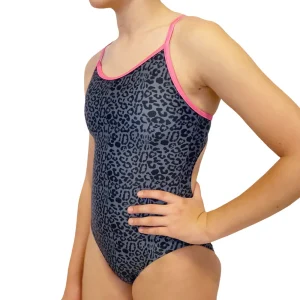 Kikx Extra Life Thin Strap Swimsuit in Leopard Print on Grey and Neon Pink Straps