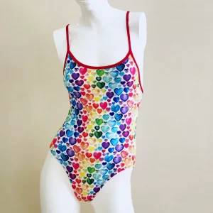 Extra Life Thin Strap Swimsuit in Multi Hearts on White with Red Straps