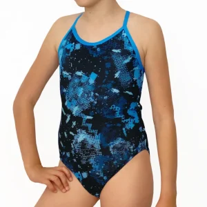 Extra Life Thin Strap Swimsuit in Black with Grunge Overlaid Blue and Light Blue with Sky Blue Straps