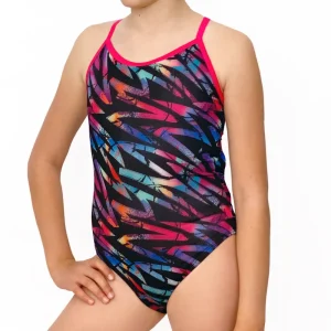 Extra Life Thin Strap Swimsuit in Black with Multi Colour Zigzag with Pink Straps